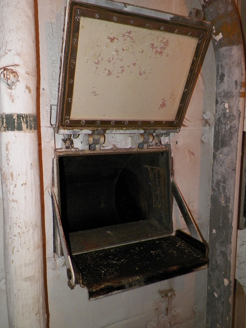 | Powder charges were passed through this safety barrier in the bulkhead on their way to the turret to prevent fires from spreading via explosion to the powder magazines |