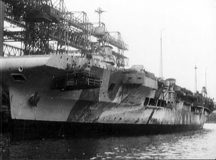 | Illustrious at Norfolk for repairs, you can easily see the scars from the near misses. |